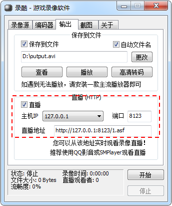 1. 基本使用方法和保存为文件相同,区别是在“输出”窗口中,要选择“直播”,并且在“主机IP”中选择本机的IP地址,在“端口”中设置端口号。